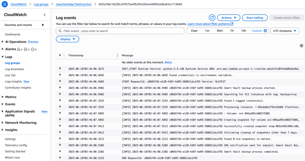 As shared in the earlier steps, the lambda functions already has necessary permissions to send logs to CloudWatch. Some of the logs sent to CloudWatch after the backups are shown in the screenshot above.