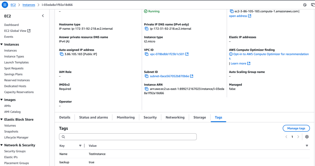 The first and most fundamental step is to clearly identify which EC2 instances our automated system should back up. This is achieved using AWS Tags. These tags provide a powerful way to categorize AWS resources. For this project, the “TestInstance” I created included the tag “backup”: “true” as shown in the above screenshot. This tag is what our Lambda function will look for when invoked.