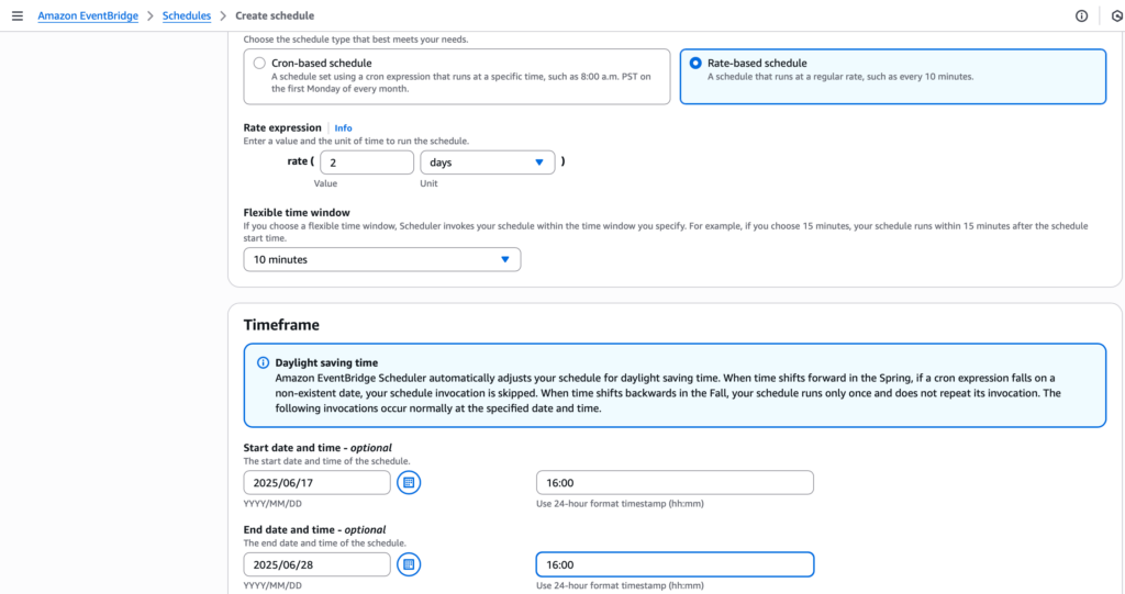 The trigger will be a schedule created in Amazon EventBridge. The schedule will automatically invoke the AWS Lambda function at a regular interval. For this project, I will create a schedule that invokes the function every two days at 16:00, as shown in the screenshot above.