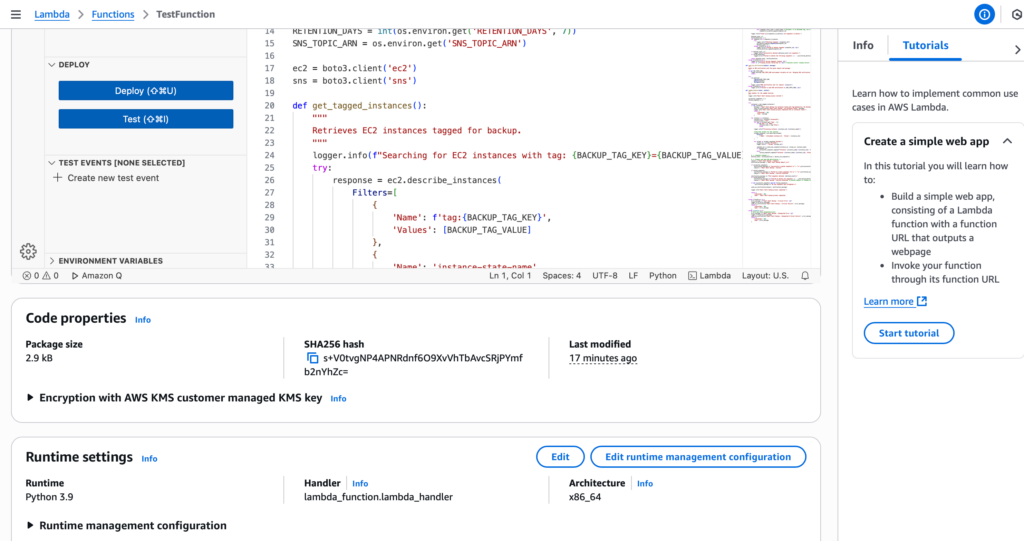 For this Lambda function, we used Python to develop the core logic for the backup. I selected Python as the runtime, and in this case, I chose Python 3.9, which is the latest version. The other details of our Lambda function are displayed in the screenshots above.
