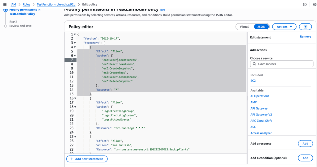 Specifically, these permissions allow it to create and delete EBS snapshots, describe EC2 instances and volumes, apply tags to snapshots, and publish notifications to an SNS topic. This was accomplished by adding a custom inline policy to the existing role as shown in the screenshot below.