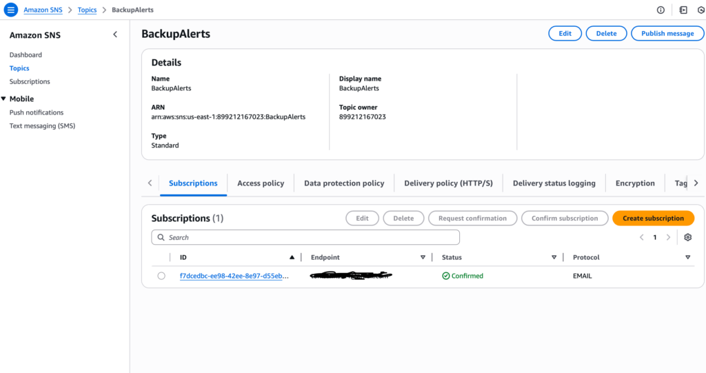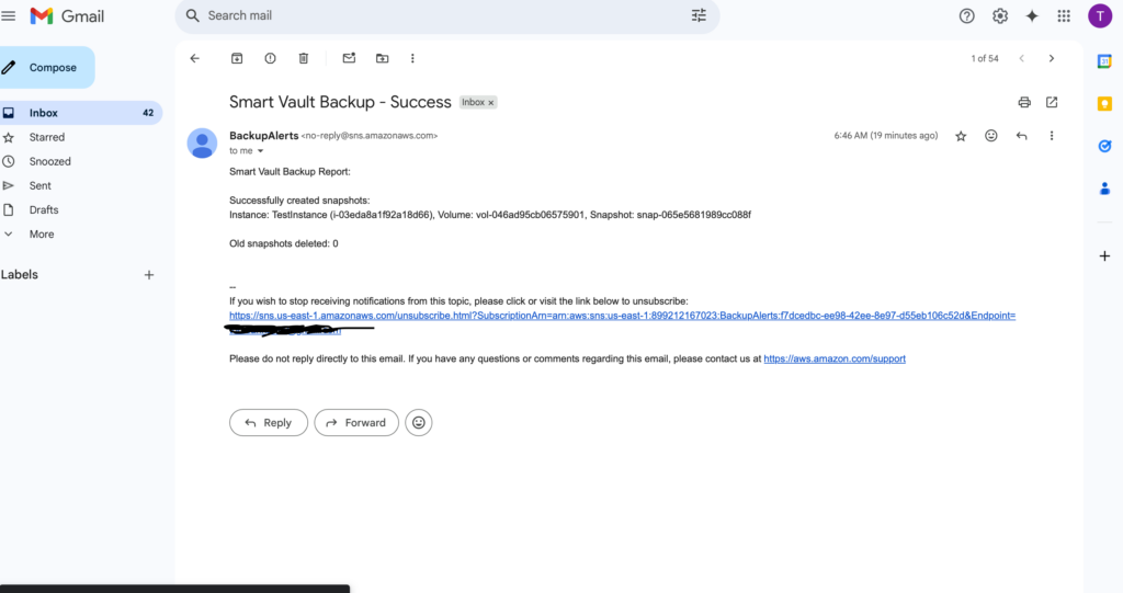 To ensure real-time updates on the status of automated backups, I integrated Amazon SNS (Simple Notification Service) to send alerts. These email notifications promptly inform all subscribers about the success or failure of backup operations, allowing any issues to be addressed immediately.